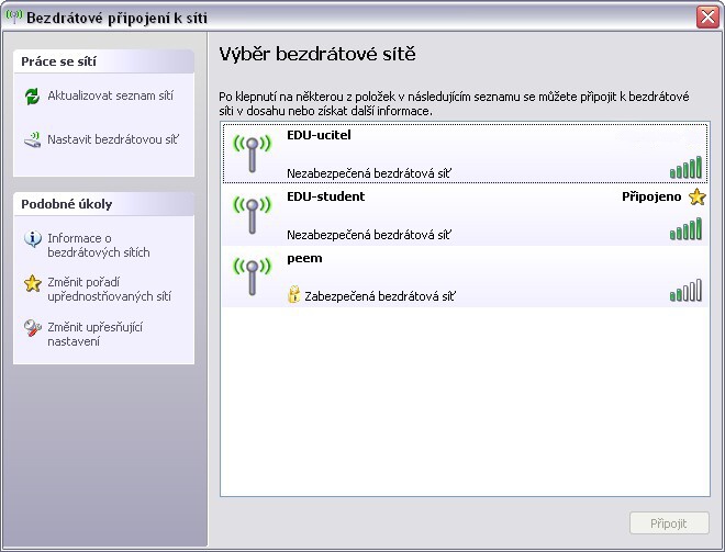 Najskôr je potrebné v nastaveniach wifi sietí notebooku alebo iného zariadenia vyhľadať a pripojit sa na sieť EDU-student, ktorá sa ukazuje ako nezabezpečená.
