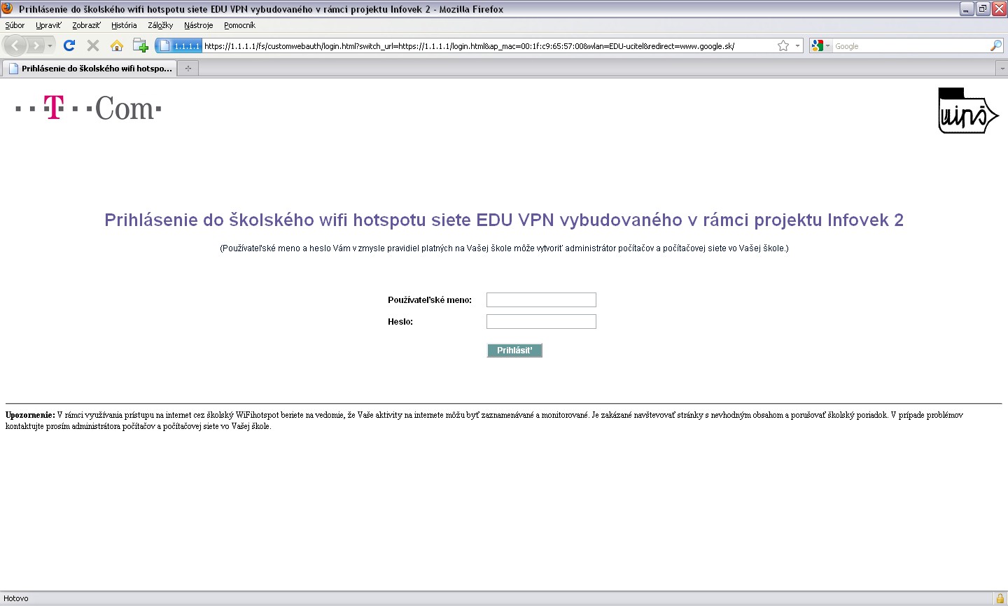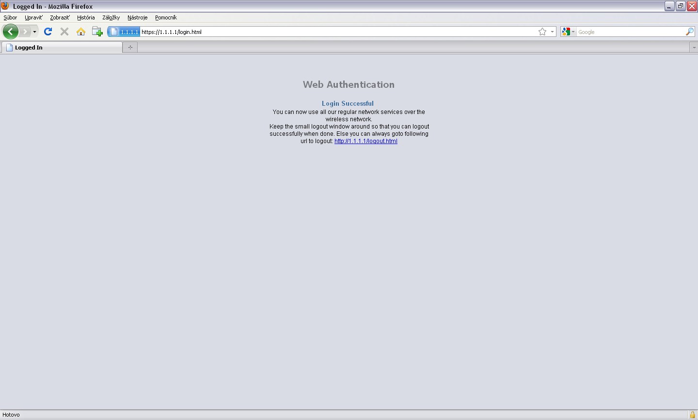Po prihlásení môžete využívať wifi v súlade s pravidlami uvedenými v Dohode o pripojení do školskej wifi siete. Okrem informácie o úspešnom prihlásení sa zobrazí aj malé okno na odhlásenie sa z wifi siete pre ukončení spojenia.